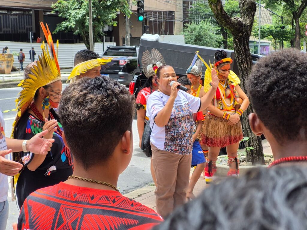 Antes do início da audiência, dezenas de familiares e apoiadores se concentraram na porta do TRF6 em um ato por justiça. Com placas, faixas, palavras de ordem e gritos transmitidos por carro de som, os manifestantes transformaram a entrada do tribunal em espaço de memória e mobilização coletiva. A manifestação contou ainda com o apoio de indígenas da Aldeia Katurãma, localizada em São Joaquim de Bicas e formada por integrantes dos povos Pataxó e Pataxó Hã-Hã-Hãe.
